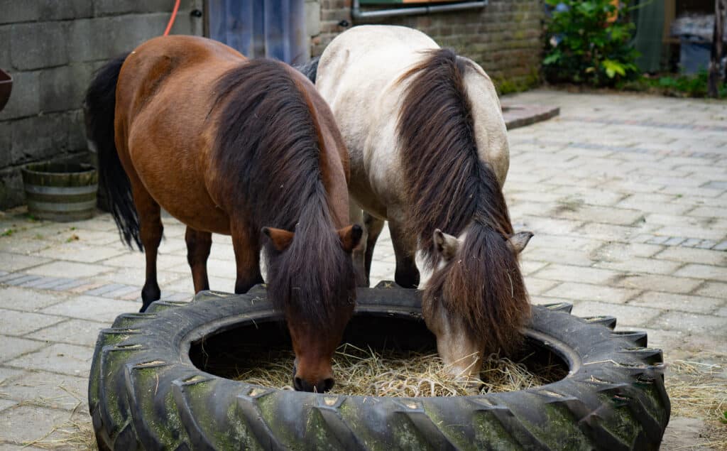 Vul de helft van het hooinet met voedzaam hooi en de andere helft bijvoorbeeld graszaadhooi of stro. Mijn paarden maken dan twee rondjes: eerst het lekkere hooi en daarna de rest. Dat is win-win, want ze doen langer met hun ruwvoer én ze hebben weer een extra rondje gelopen.